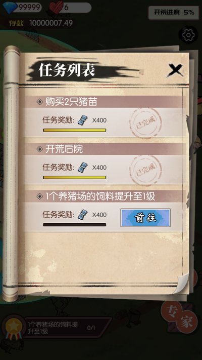 2、根据新手引导完成初始任务,优先购买猪崽并开始养殖