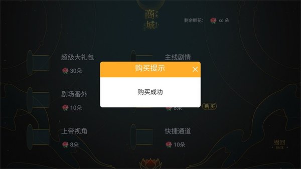 3、由于本游戏已经成功破解无限鲜花,我们可以打开鲜花商城直接购买超级大礼包、剧情番外、主线剧情等物品。