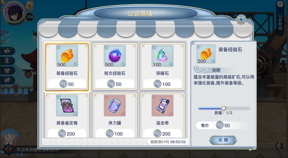 7、还有一个“公会兑换商店”,点它就能打开商店。用你做任务攒的贡献币,能换点养成的材料。缺啥东西的时候,可以过来淘淘宝。