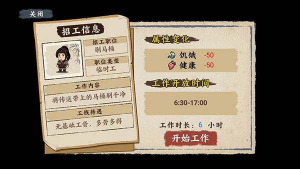 1、进游戏头一件事就是过新手教程,老玩家也别嫌烦跳过。讲真,虽然给的钱不多,但足够你在唐朝撑过第一个星期了。前期的工作跟那些打工模拟器差不多,选择少,还净是些费时间的体力活。那个刷马桶的工作我个人不推荐,干一次健康值掉一大截,回头生病了还得花钱看大夫,纯属赔本买卖。