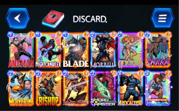 中文卡表: 蚁人、夜行者、刀锋战士、莫比亚斯、安吉拉、蜂群、金刚狼、毕肖普、西芙女士、剑仙、天启、阿美莉卡