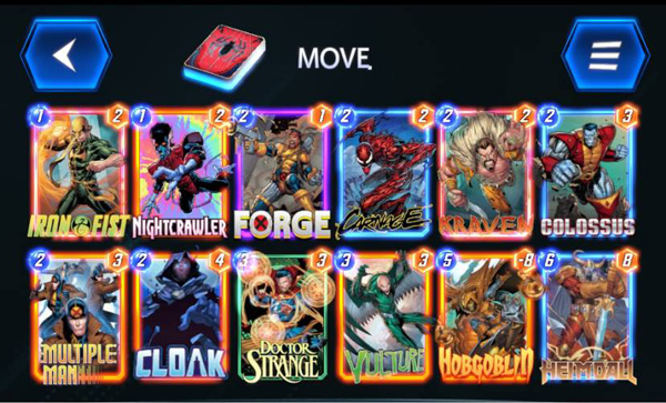 中文卡表: 铁拳、夜行者、锻造者、克莱文、钢力士、复制人、斗篷、奇异博士、秃鹫、恶鬼、海姆达尔