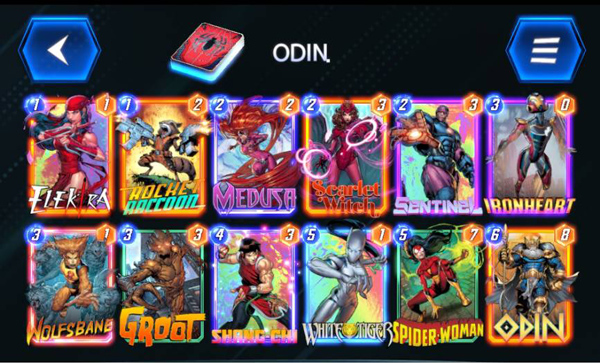 中文卡表: 艾丽卡、火箭浣熊、美杜莎、猩红女巫、哨兵、铁心、狼毒、格鲁特、尚气、白虎、蜘蛛女、奥丁
