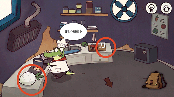 出来之后,桌子上有个萝卜,点了。菜板上有把刀,也点了。这里的任务是要找齐3个胡萝卜。(吐槽一下,我手速太快,刀一下就点没了…重开了一次,萝卜又被我点掉了…)