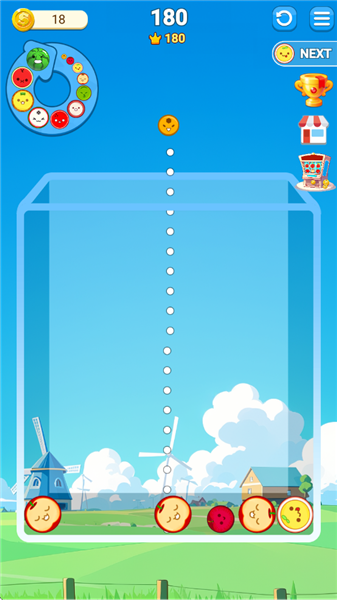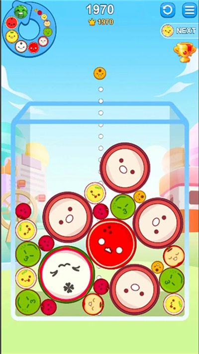 4、拖水果合成的时候,手稳一点,对准了再放。界面上那个虚线是干啥的?就是给你瞄准用的。千万别手一抖扔到犄角旮旯里,几个水果卡在那动弹不得,后面就没法玩了。保证每次都扔到能挨着同类水果的地方,这样合成起来才顺畅。