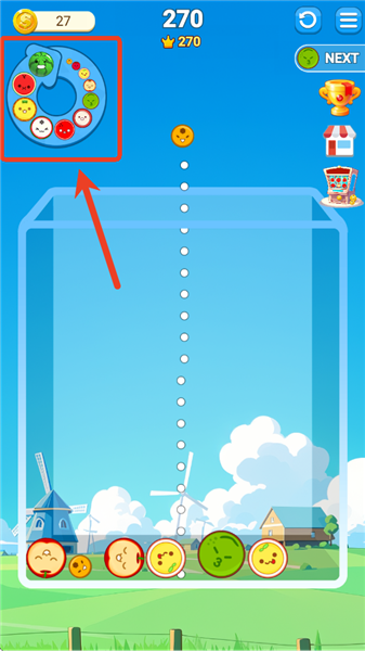 3、下一个掉下来的水果是啥,系统都是随机给的。你可以瞅一眼左上角那个合成顺序的提示,心里好有个数,提前规划下往哪儿扔。