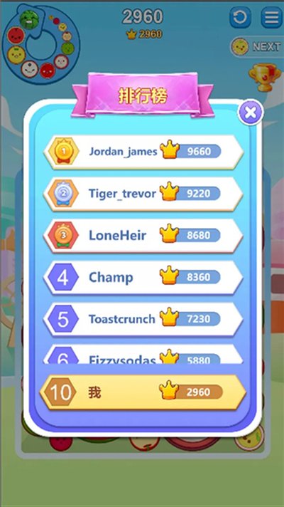 4、没事多去排行榜逛逛,看看榜上那些大佬是怎么玩的。别光看分数,要学人家的布局思路,特别是高级水果是怎么摆放和合成的。然后结合自己的习惯,琢磨一下怎么优化操作,破自己的记录就是这么来的。没开玩笑。