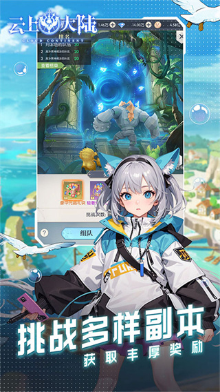 云上大陆是一款奇幻冒险风格的大型多人在线手游,玩家将在漂浮在天空中的大陆上开启探索之旅,有不同的区域和神秘地图可以自由冒险、打怪升级、收集装备,游戏主打角色养成和战斗体验,可以选择不同职业,学习技能,不断提升实力,在冒险过程中还能挑战副本和BOSS获得更强装备,有好玩的单人冒险还能和其他玩家组队战斗,一起挑战更强敌人体验团队配合的乐趣慢慢成长为云上大陆的强者。