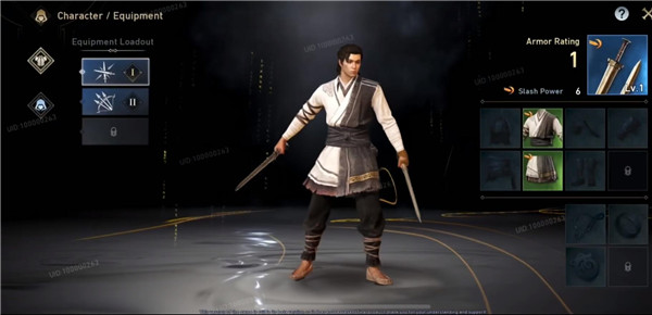 2、这个就是角色界面了,能换衣服也能换家伙。常用的武器就是单手剑和弓箭这两种,老刺客的标配了。