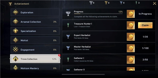 5、游戏里内置了一大堆成就,没事干可以去刷刷。完成这些成就给的奖励还挺丰厚,攒下来的资源正好可以拿去换更好的武器装备,形成一个良性循环。