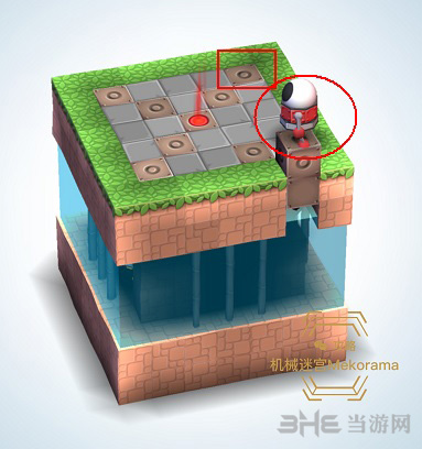 先把机器人移动到截图里标出来的地方,然后快速拉动旁边的机关让它升起来。等机器人转身面对那个方块的时候,再把机关放下去,它就能走到方块上了。