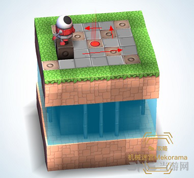 1.小红人到达图中圈圈处,赶紧滑动机关使其升高,当小红人正面朝方块时滑动机关放下,使小红人到达方块处