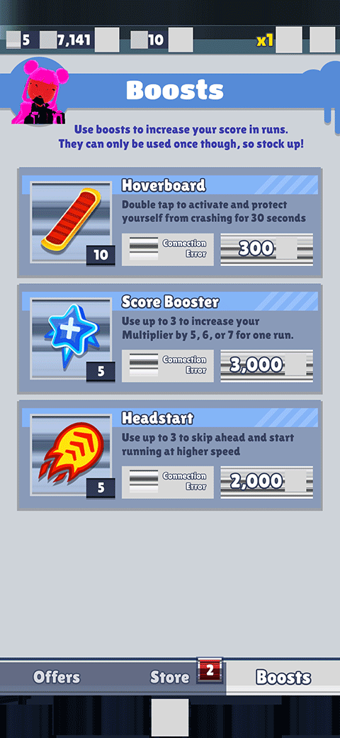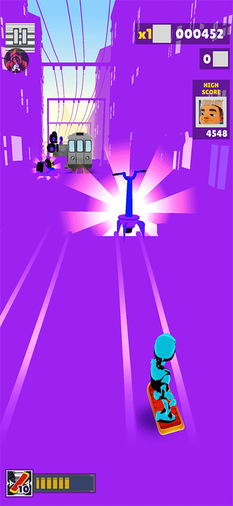 3、游戏内提供多种可购买道具,例如得分倍数、滑板与火焰推进器,得分倍数需在开局选择,滑板可在奔跑过程中双击屏幕使用