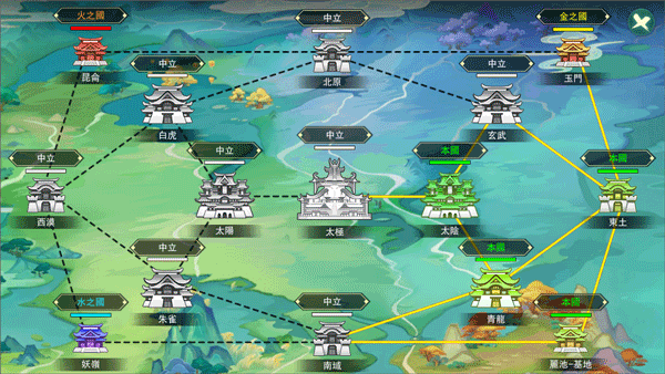 版图是国家系统里最主要的PVE玩法。每个服都有个大本营,从基地出发去打旁边的区域副本拿积分,哪个阵营积分高,这块地就归谁。当然也能去抢别人已经占了的地盘。