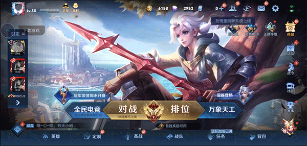 2、进来以后,主界面就摆着几个模式让你选,对战和排位。对战里头花样多点,5v5、3v3、1v1还有训练营都有,排位赛就只有正经的5v5了。大家看下面这张截图。