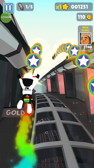 3、要是你捡到了那个喷射背包,恭喜你,直接上天了。在天上的这段时间是绝对安全的,没有火车也没有障碍物,你就尽可能多地去吃天上的金币就行了。