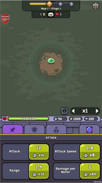 1、先把游戏下好装上,打开后进游戏,看到下面截图里这个界面没,点那个绿色的按钮就能升级史莱姆的攻击力。