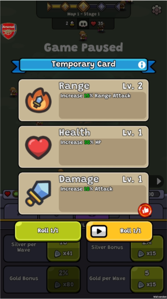 3、打怪会掉落临时卡片,拿到手可以用来给生命、攻击、防御这些属性进行升级。