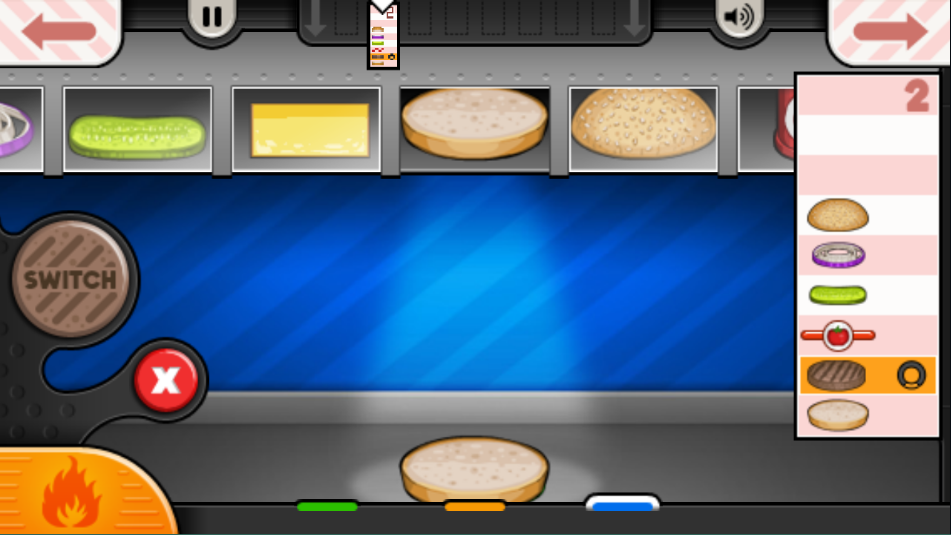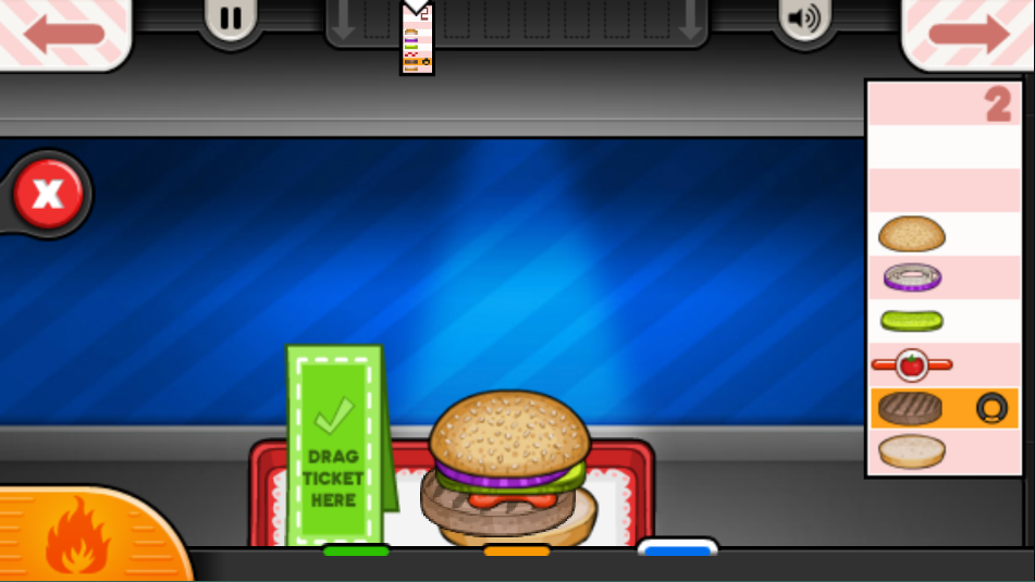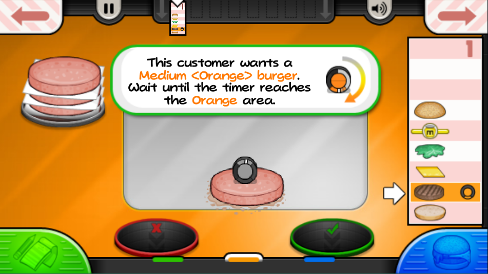 3、然后就去后厨干活,先把肉饼扔烤架上。注意看肉饼上的那个圈,变成橙色了就赶紧给它翻个面,别烤糊了。