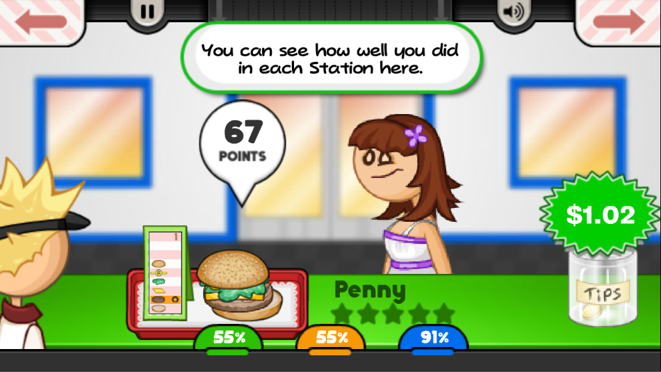 6、最后把汉堡给客人,他会根据你的表现给钱和评分。做得越好,钱越多,评价也越高。