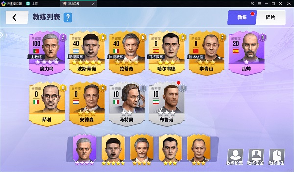 教练系统是这游戏里提升战力的一个大头,比你单纯升球员加的战力多多了,所以务必先把教练这块儿搞明白。好了废话不多说,你点进教练界面,就能看到你的教练组列表,目前版本有穆里尼奥和瓜迪奥拉两个紫卡教练,还有几个闪金、金卡和银卡教练。紫卡和闪金教练基本都得靠教练嘉年华活动抽,魔力鸟每天刷体力也有机会出(一天两次),另外有个充2000的限时活动也能直接拿。闪金教练在联盟等级礼包、球队挑战这些地方能搞到点碎片,但主要来源还是得靠抽。