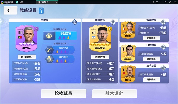 点开教练设置,这里能设定主教练的战术,还有助理教练、体能教练、门将教练、技术总监这些位置。下面那个轮换球员设置,我个人觉得替补加成不高,没必要刻意去堆。