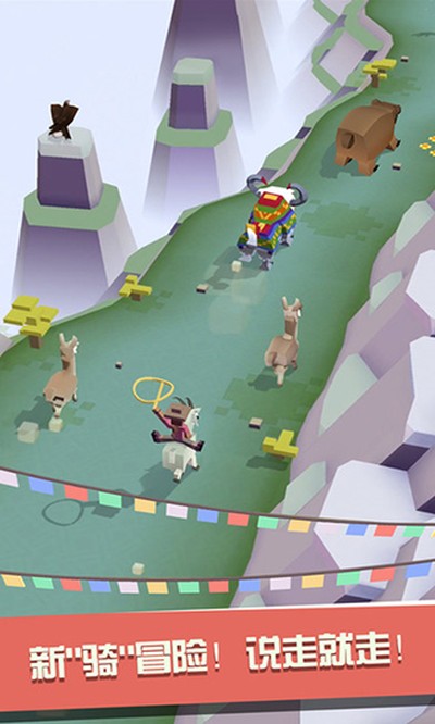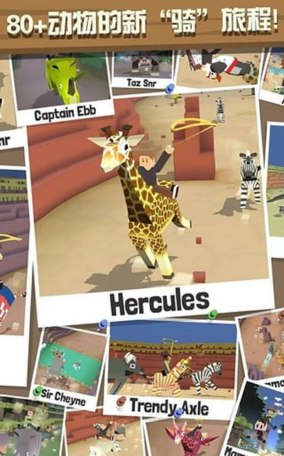 3、一路上还能碰到鸵鸟和斑马,操作都一样,跑近了跳上去就行。每局都有任务,让你抓够一定数量的动物,骑到终点线,就能跟新抓的动物拍个照,然后它就正式成为你动物园的一员了。