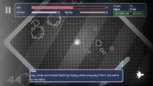 4、开打以后,点屏幕左边就往左飞,点右边就往右。两边一起按就是开火,把前面的敌人和石头都给它干碎。上面那排HP是你的血条,Ammo是子弹,Bomb就是炸弹,小学英语水平都看得懂。
