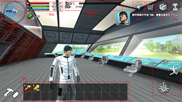 3. 操作界面包含移动摇杆、地图、状态栏、商店、背包与排行榜等功能模块,布局清晰直观,各项功能一目了然,玩家可以快速上手并进行操作。