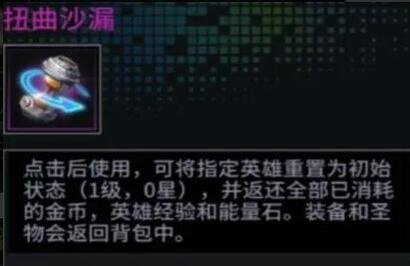 2.扭曲沙漏:用于给未觉醒过的英雄进行重置,重置后英雄恢复到1级,0星的状态,并返还全部消耗的金币,经验和能量石。装备和圣物会返回包裹中。