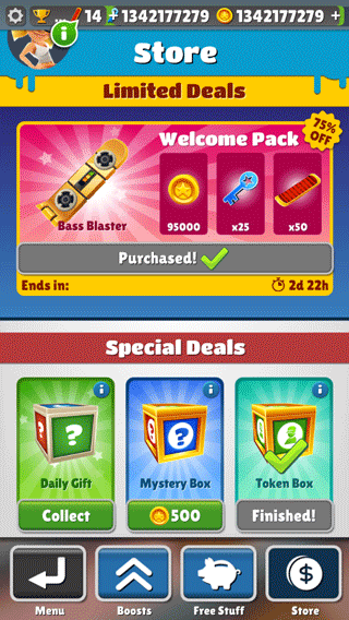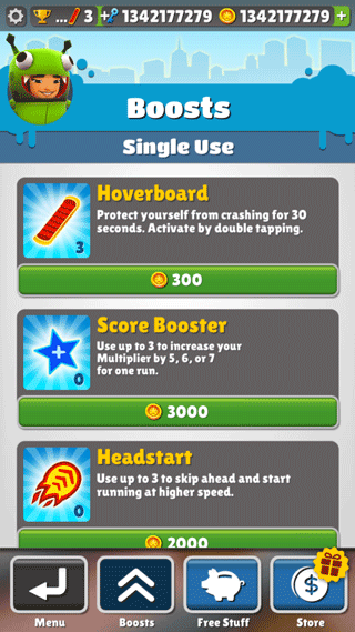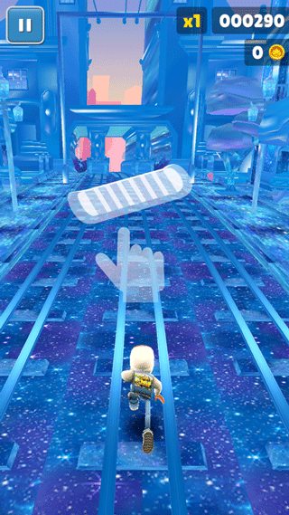 滑板这玩意儿怎么用,简单说两句。你得先有板子才能用,数量显示是0的时候,双击屏幕是没反应的。必须花金币去商店买,买一个只能用一次,撞到障碍物的时候能帮你挡一劫。