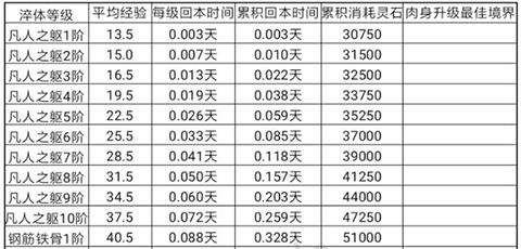 这表里把每个境界淬体的最佳时间点都列出来了。灵石怎么花得精打细算, 接下来我就掰扯掰扯灵石的分配和各个境界淬体的时机。