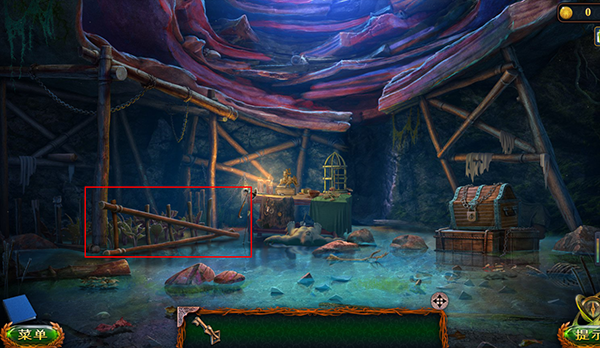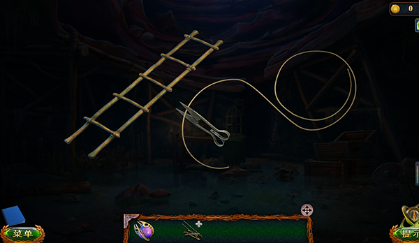 6、箱子里面能拿到一个球面石和一把剪刀。现在可以回去修梯子了,把之前收集的木材碎片装上去,再用绳子捆好,最后用剪刀把多余的绳头剪掉。