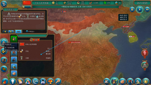 右边这一栏就是你能干的各种事,怎么把你国家一步步搞强,就靠这些操作了。