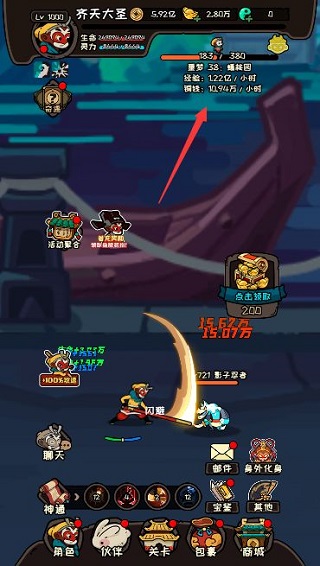 看到关卡进度下面那行字没?“每小时可获得的经验、金币”,那个就是你在这关挂机的离线收益。