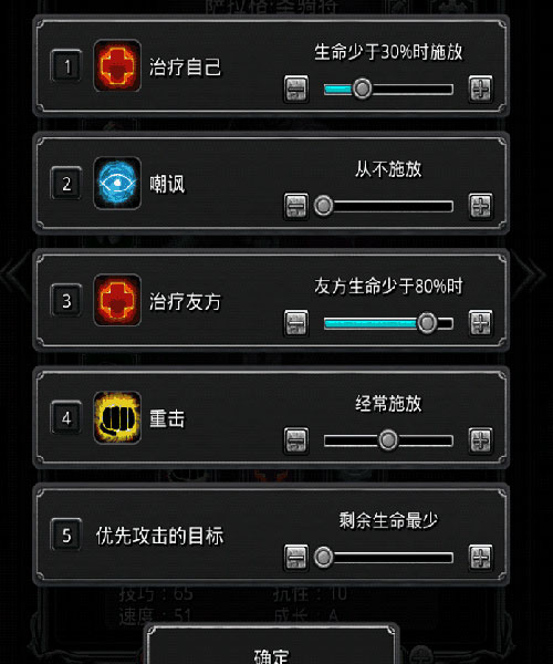 6、战斗默认是自动挂机的,但你可以随时取消,手动操作。或者出发前就给队员们设好战斗策略。比如圣骑这种单奶,可以设定成“队友血量低于80%就加血”,这样能让全队血线一直保持在安全状态。看到下面这张截图的设置界面没,就这么搞。