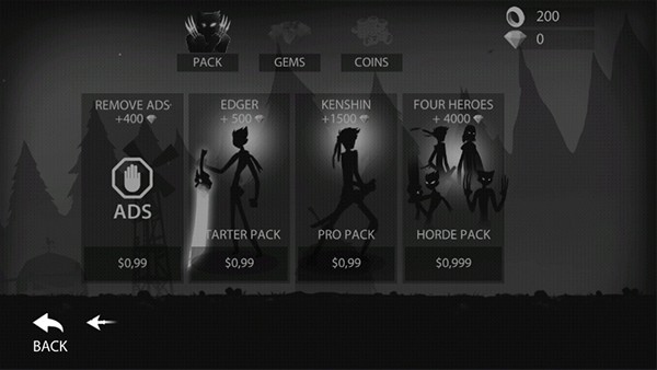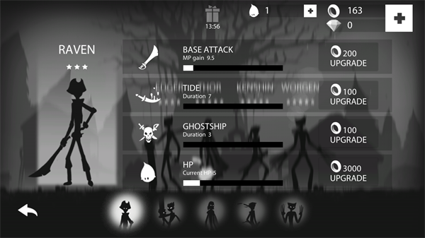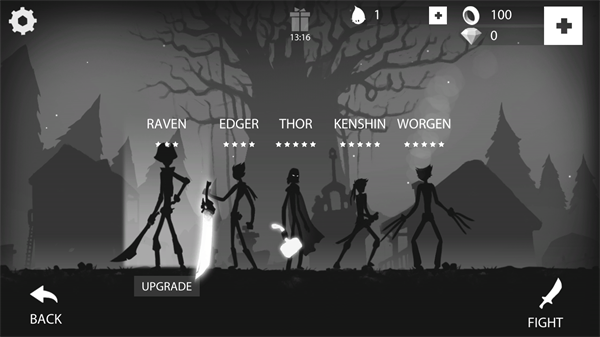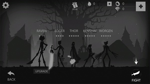 1、一上来就能看到五个火柴人给你选,不过大伙儿都懂,除了第一个免费的,后面那几个都得拿金币和钻石去换。