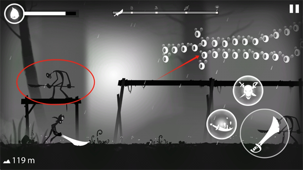 3、操作挺简单,点屏幕就是跳,连点两下就是二段跳。右手边那块儿就是攻击和放技能的按键。