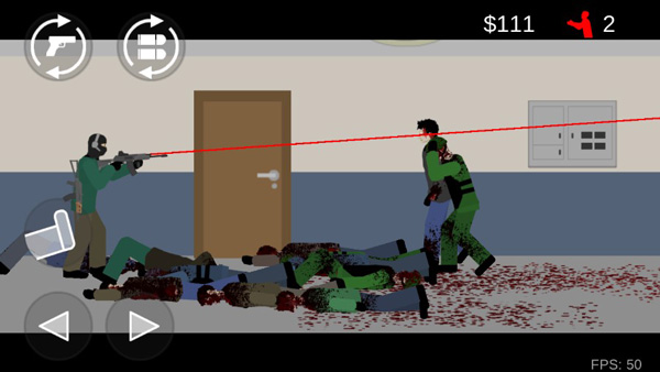 操作这块没啥好说的,左下角控制左右移动,左上角是换枪和装弹。右下角那个图标是个保命神技,僵尸要是贴脸了,能一脚把它踹个跟头,拉开距离。这脚法不错,运用熟练的话一次能踹翻俩。顺便提一句,这游戏的赏金机制挺有意思:打腿一枪2块钱,打身子5块,爆头直接给10块。很真实。