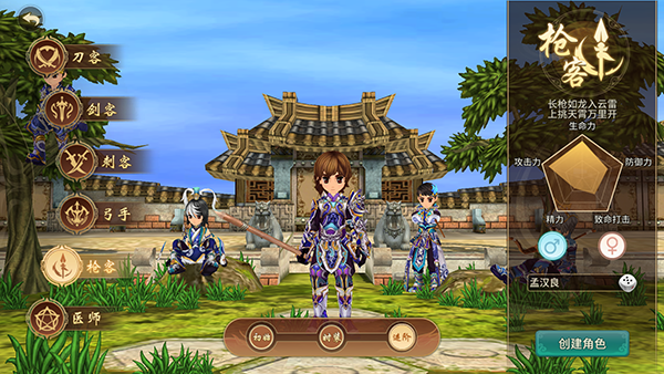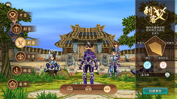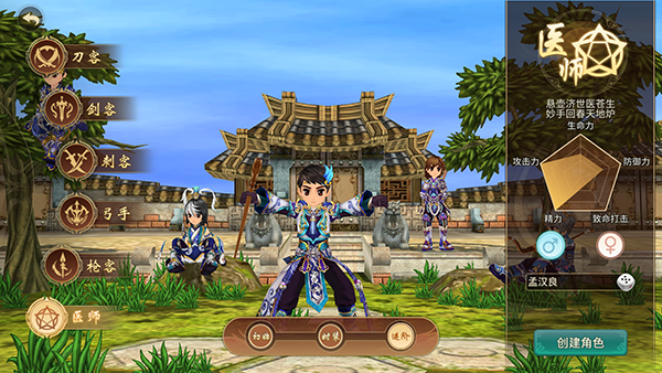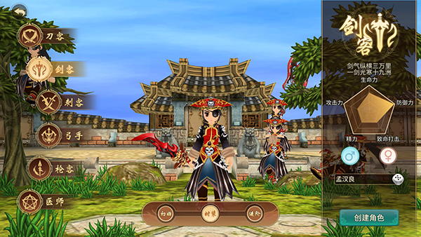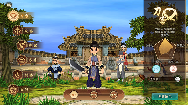 职业选择还挺多的,剑客、刀客、医师这些经典武侠职业都有,每个职业的技能和打法都不一样。玩到后面还能转职成更厉害的形态,比如“剑仙”或者“刀皇”,体验不同的成长路线。技能可以自己随便搭配,琢磨出一套连招,不管是打爆发还是玩控制都由你定。