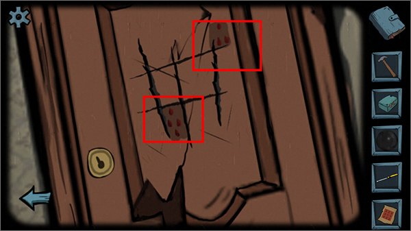 6、这一步需要观察一下。看看柜子后面墙上的图案,再看看门上的图案,把这些点点画到你刚拿到的纸条上(游戏里不会自动合并,得自己脑补)。你会发现,一个点的图案对应数字2,两个点的对应1,三个点的对应3,四个点的对应2。这意思就是密码箱上第几个按钮按几下,所以密码就是2132。输进去,拿到灯泡。