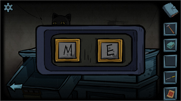 8、这时候去看猫,眼睛里会显示出信息:ME。去柜子那边输入这两个字母,就能拿到钥匙和白猫的手臂。把手臂给猫装上,它会给你个小猫猫。