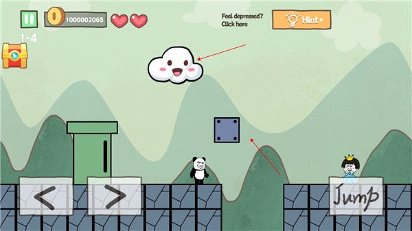 4、这关不要管前面的钥匙直接走,这里跟第一关有点类似,也有一个隐形的方块勾引出来就行,不要从云上跳,云也是个陷阱。