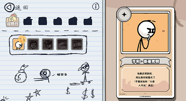 想收集人物档案,就得在场景里点击人物的图标。没收集过的人物名字是蓝色的,收集过的会变成红色。讲真,有的人物收集起来特别麻烦,一个场景里人又多,画面过得又快,得反复刷这个场景才能点到。还有些人藏在背景的画里面,我为了方便找人,都把画面放大到2倍才看清。每个人物收集之后都会有一段介绍,还挺有意思的。
