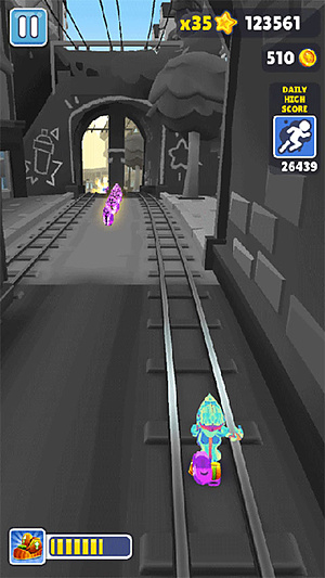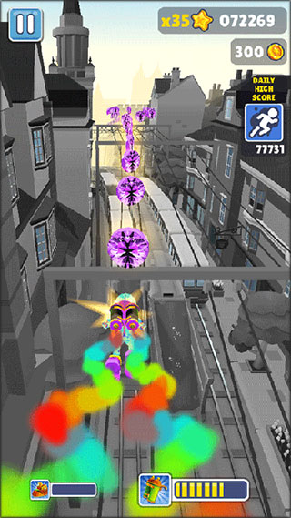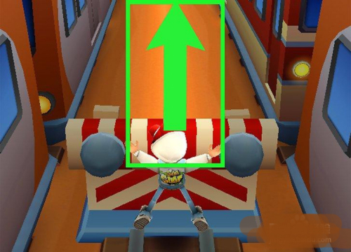 6、这就导致你在右边隧道跑的时候,跳起来能看到后面有没有火车,但在左边隧道就看不清。右边没车,你就直接大跳过去;要是有车,就大跳之后快速往左划两次,直接溜到左边隧道去。