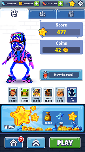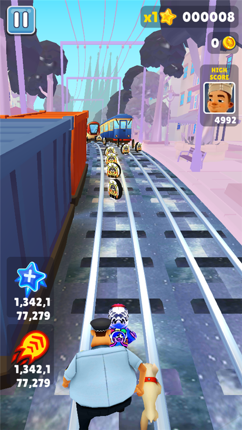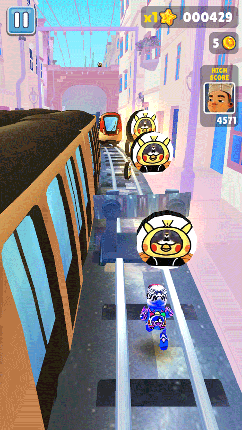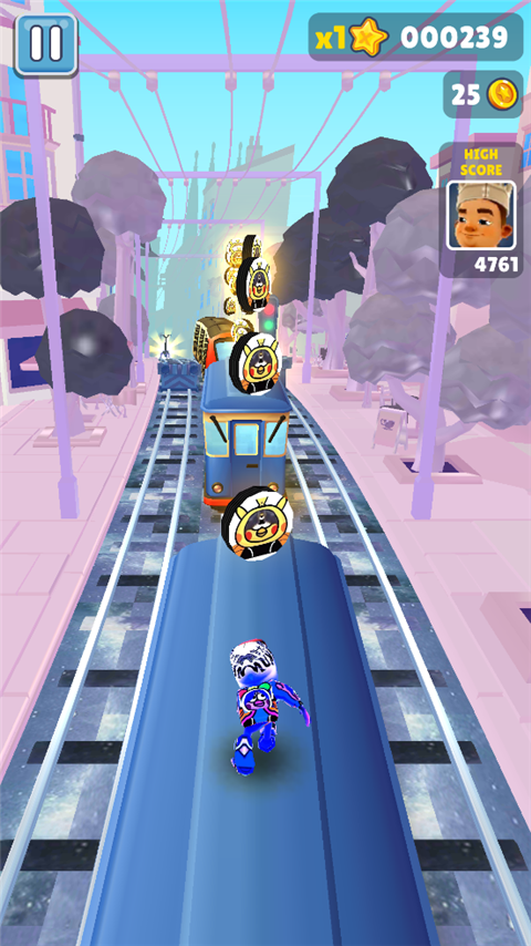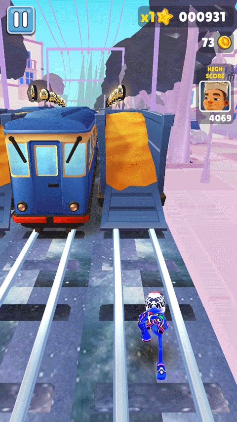 最基本的玩法,说白了就是躲东西。屏幕上划跳过矮的障碍物,遇到开过来的火车就得左右滑动来闪避。这都是刻在DNA里的操作了。