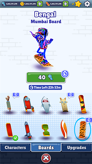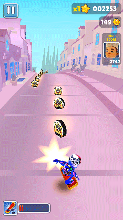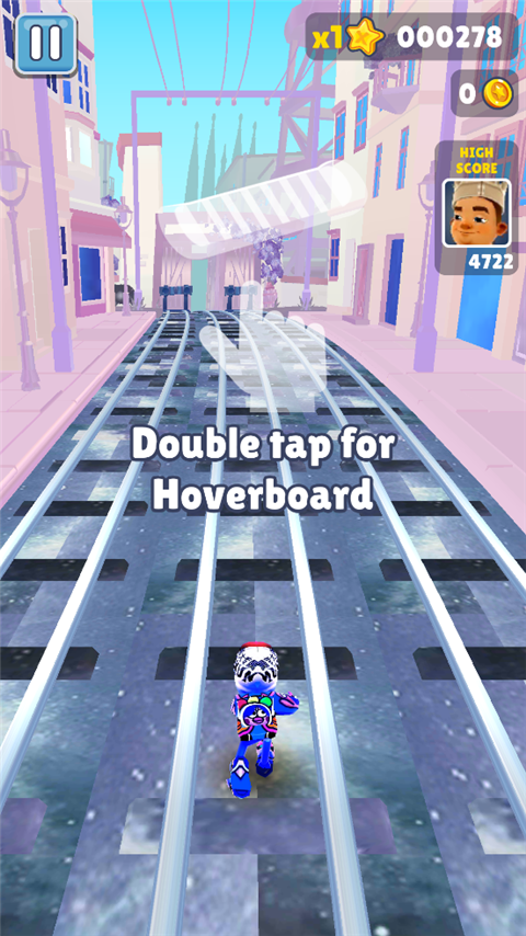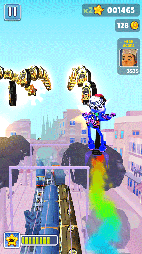 游戏里的道具有两种。一种是路上随机刷新的,比如磁铁、喷气背包啥的,各有各的神奇效果。另一种就是主动道具滑板,双击屏幕用,能给你多一条命。