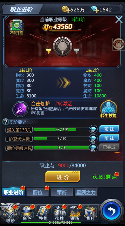 1、到了游戏中后期,想提战力就得靠“职业进阶”,也就是转生。你需要做一堆目标任务,再攒够职业点数才能进阶。而且这进阶系统还挺绕,不是简单的一转、二转,它给你搞出了个什么“0转1阶”、“0转2阶”这种名堂。
