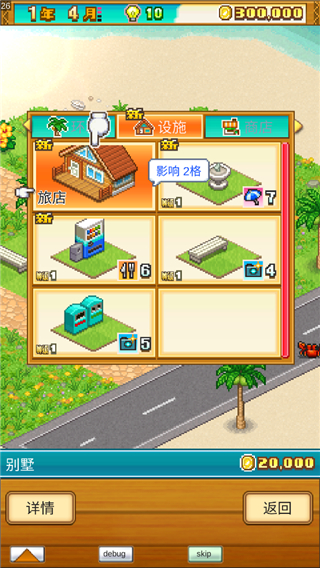 道路可以铺在沙滩和草地上,桥能架在岸边和海上。要是你建了租车店,客人就能在道路和桥上开车,移动速度会快一些(不过路太短的话其实没啥意义,这游戏有个细节,客人开车要先加速,到地方了还得减速,路太短的话,加速减速花的时间还不如直接走过去快)。道路和桥都占4格,建造的时候不能一格一格地挪,只能四格四格地放,感觉它用的地图网格跟别的设施都不是一套系统。道路和桥上面也不能放别的东西。