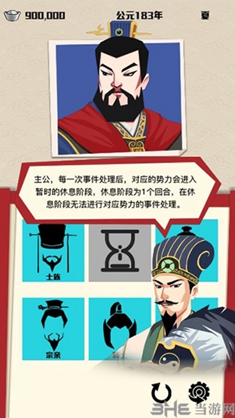 3、然后点“开始游戏”就行。看到截图里这个界面没,最上面是你的钱、年份和季节。四个季节过完算一年。底下那六个图标,就是你手底下要平衡的六大势力。